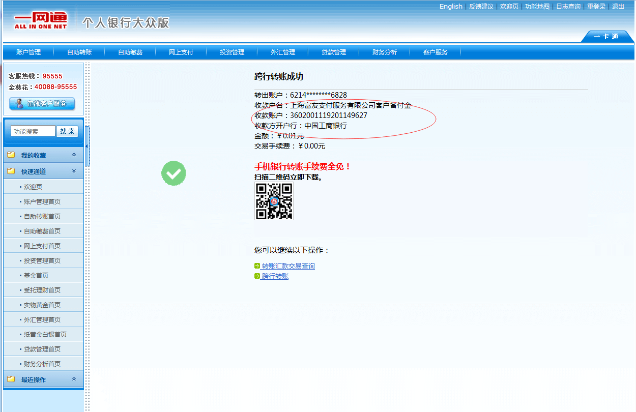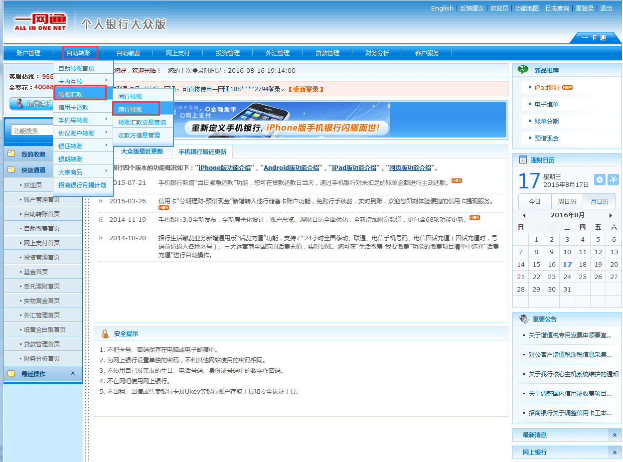第三步,点击“自助转账”,再点击“转账汇款”,然后再点击“跨行转账”,如下图: