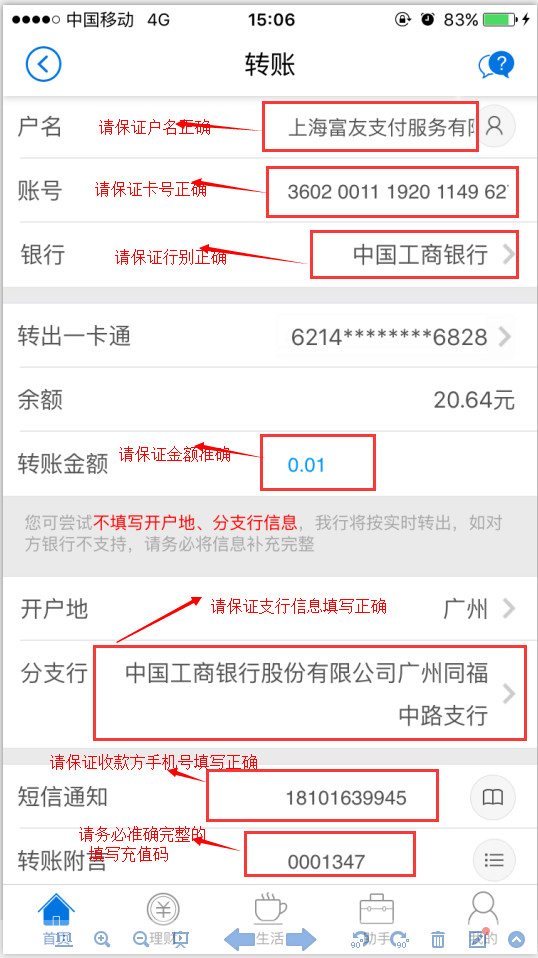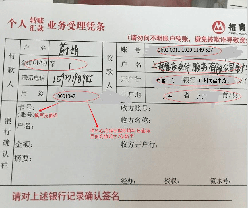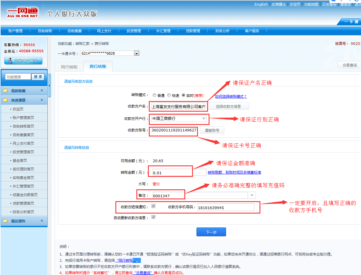 第四步,填写准确的转账信息,包括:户名,金额,卡号,开户地,分支行信息,且 充值码(为 7 位数字)一定要准确完整填写,并点击“下一步”,如下图:
