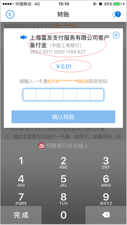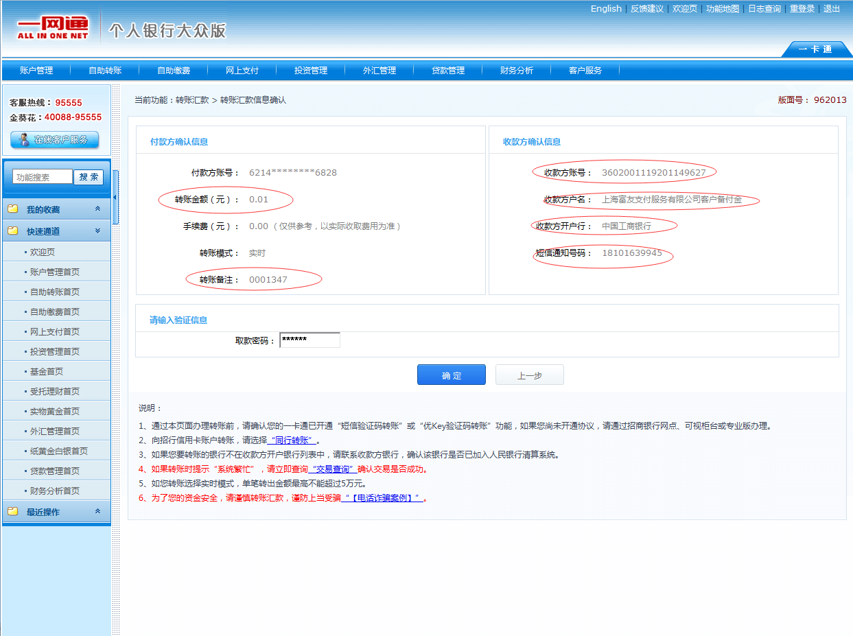 第五步,确认相关信息无误后,点击“确认转账”,如下图: